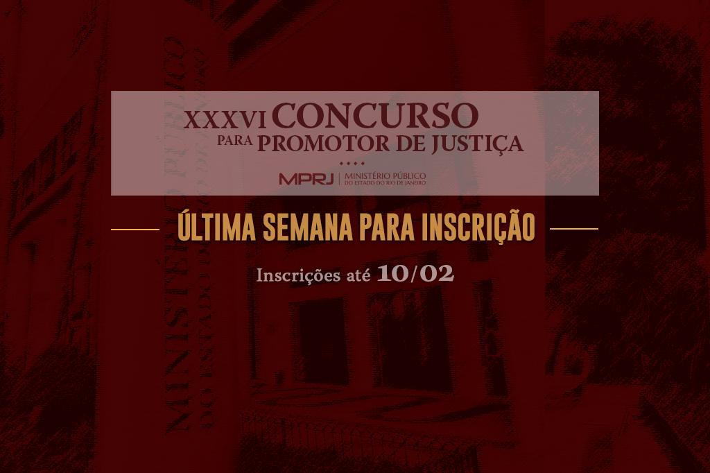 Na próxima quinta-feira (10/02) encerram-se as inscrições para o XXXVI Concurso Público para ingresso na classe inicial da carreira do Ministério Público do Estado do Rio de Janeiro (MPRJ), que irá preencher 51 vagas para o cargo de promotor de Justiça substituto, sendo 15 de provimento imediato. O concurso é executado pela Fundação para o Vestibular da Universidade Estadual Paulista (VUNESP).