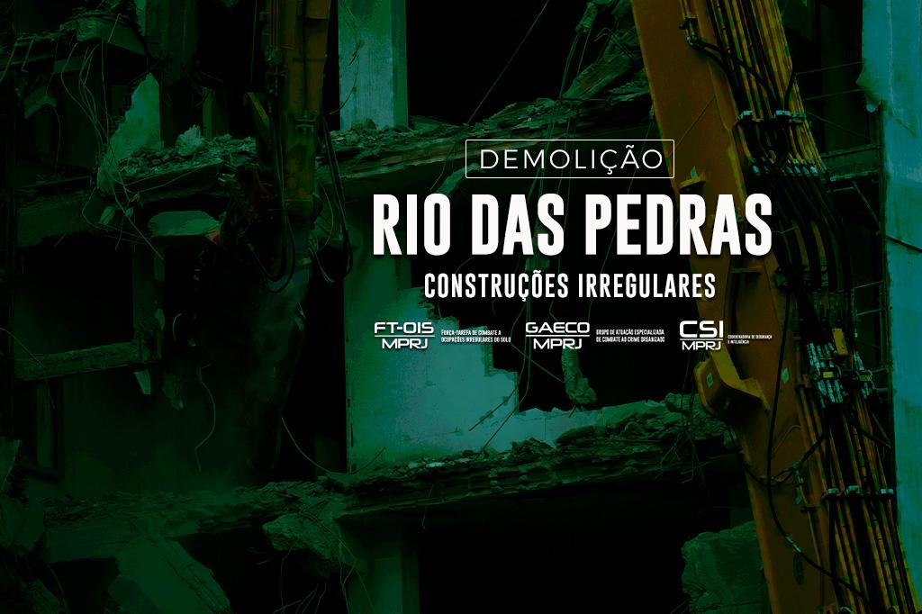O Ministério Público do Estado do Rio de Janeiro (MPRJ), por meio da Força-Tarefa do Grupo de Atuação Especializada no Combate ao Crime Organizado para enfrentamento à ocupação irregular do solo urbano (GAECO/FT-OIS), com auxílio da Coordenadoria de Segurança e Inteligência (CSI/MPRJ), e em parceria com a Secretaria Municipal de Meio Ambiente e com a Polícia Militar realiza, nesta quinta-feira (03/02), uma operação para demolir oito construções irregulares em área pública, na comunidade de Rio das Pedras, na Zona Oeste do Rio, dominada pela milícia.