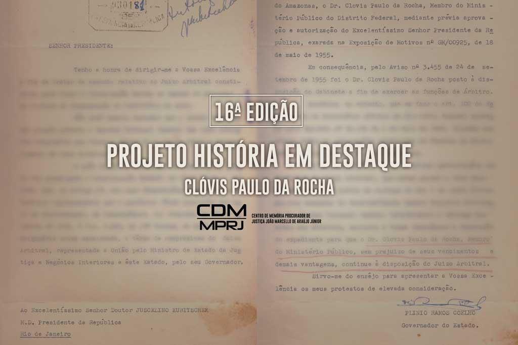 O Ministério Público do Estado do Rio de Janeiro (MPRJ), por meio do Centro de Memória Procurador de Justiça João Marcello de Araújo Júnior (CDM/MPRJ), apresenta, na 16ª edição do projeto “História em Destaque”, o ofício que solicita a manutenção do ex-procurador-geral de Justiça Clóvis Paulo da Rocha como Juiz Arbitral do litígio entre o Estado do Amazonas e Território Federal do Acre, em decorrência de sua desanexação. Elaborado pelo então governador do Estado do Amazonas, Plínio Ramos Coelho, o ofício nº 55 de 30 de junho de 1956 é relevante documento histórico, e foi destinado ao Presidente da República Juscelino Kubitschek. Seu objetivo era a manutenção de Clóvis Paulo da Rocha, à época procurador de Justiça do Ministério Público do Distrito Federal, na função de árbitro, que tem como objetivo minimizar a judicialização de litígios relativos a direitos patrimoniais e pode ser utilizada pela administração pública direta e indireta para a resolução de conflitos.