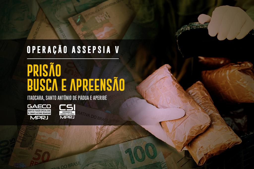 O Ministério Público do Estado do Rio de Janeiro (MPRJ), por meio do Grupo de Atuação Especializada de Combate ao Crime Organizado (GAECO/MPRJ), em conjunto com a Coordenadoria de Segurança e Inteligência (CSI/MPRJ) e a Polícia Militar, realizou, nesta sexta-feira (21/10), a operação Assepsia V. O objetivo foi cumprir 24 mandados de prisão, 1 apreensão de adolescente e 27 de busca e apreensão contra investigados por associação criminosa voltada para o tráfico de drogas nas cidades de Santo Antônio de Pádua, Aperibé e Itaocara, no Noroeste fluminense.