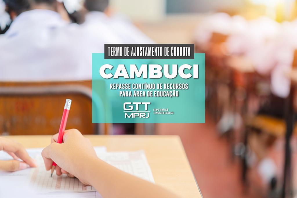 O Ministério Público do Estado do Rio de Janeiro (MPRJ), por meio do Grupo Temático Temporário de Educação (GTT Educação/MPRJ), celebrou Termo de Ajustamento de Conduta (TAC) com o Município de Cambuci para que sejam estabelecidas as medidas necessárias para a realização e regularização dos repasses mensais de recursos para a área da Educação. Esses repasses devem ser feitos para contas específicas, a serem geridas com exclusividade pelo secretário Municipal de Educação.