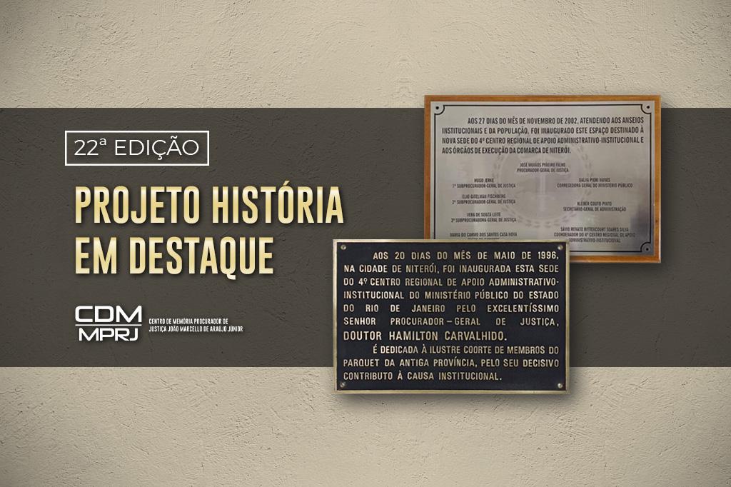 O Ministério Público do Estado do Rio de Janeiro (MPRJ), por meio do Centro de Memória Procurador de Justiça João Marcello de Araújo Júnior (CDM/MPRJ), apresenta a 22ª edição do projeto História em Destaque: “As histórias através das placas”. Nesta edição, são evidenciados dois destes objetos museológicos, que representam momentos distintos do Centro Regional de Apoio Administrativo Institucional/CRAAI Niterói e que demonstram a dinâmica da instituição que, a partir da Carta Magna de 1988, passou a ter um crescimento significativo.