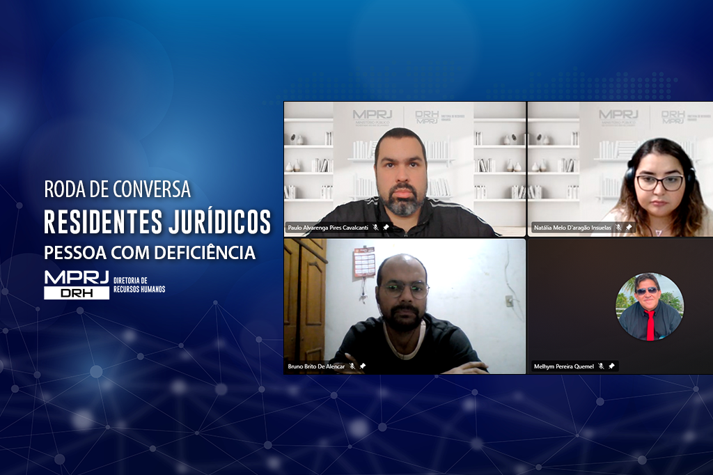 O Ministério Público do Estado do Rio de Janeiro (MPRJ), por meio da Gerência de Estágio (GESTAG) da Diretoria de Recursos Humanos (DRH/MPRJ), realizou, nesta segunda-feira (19/06), uma roda de conversa online com residentes jurídicos com deficiência que atuam na instituição. O encontro foi uma oportunidade para os estagiários, lotados em diferentes municípios fluminenses, se conhecerem e trocarem experiências acerca da residência jurídica.