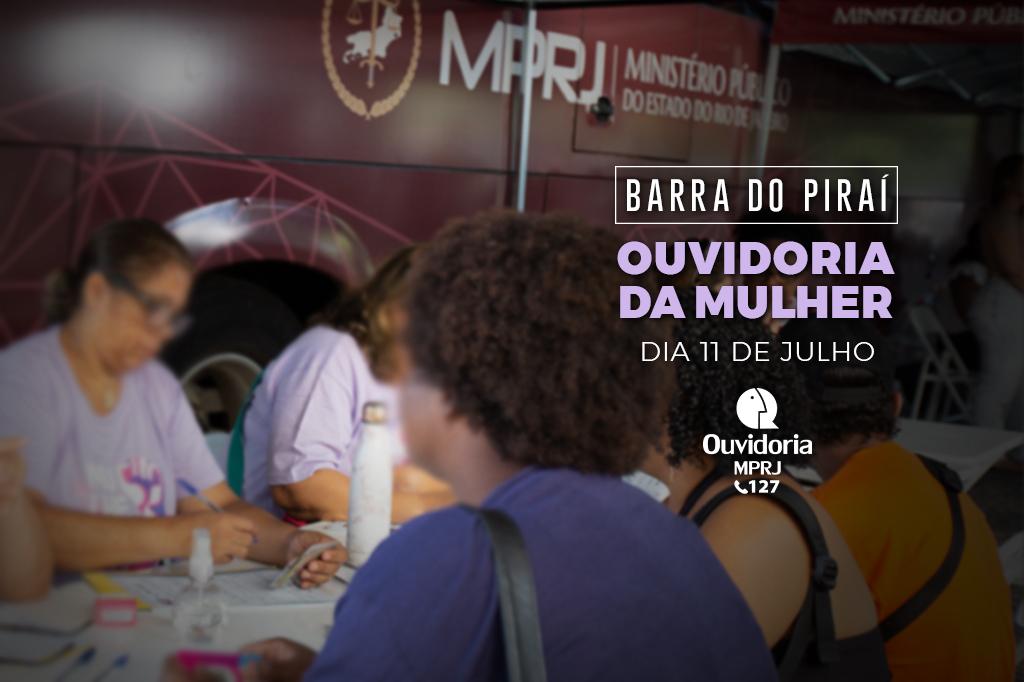 O Ministério Público do Estado do Rio de Janeiro (MPRJ) realizará, na próxima terça-feira (11/07), a Ouvidoria itinerante da Mulher, das 9 às 14h, na praça Nilo Peçanha, em Barra do Piraí. O evento é uma parceria do MP com a Ouvidoria do Creci, Ouvidoria da Mulher OAB subseção Barra do Piraí, projeto Empoderadas, NAC da Fundação Leão XIII e Detran Mulher.
