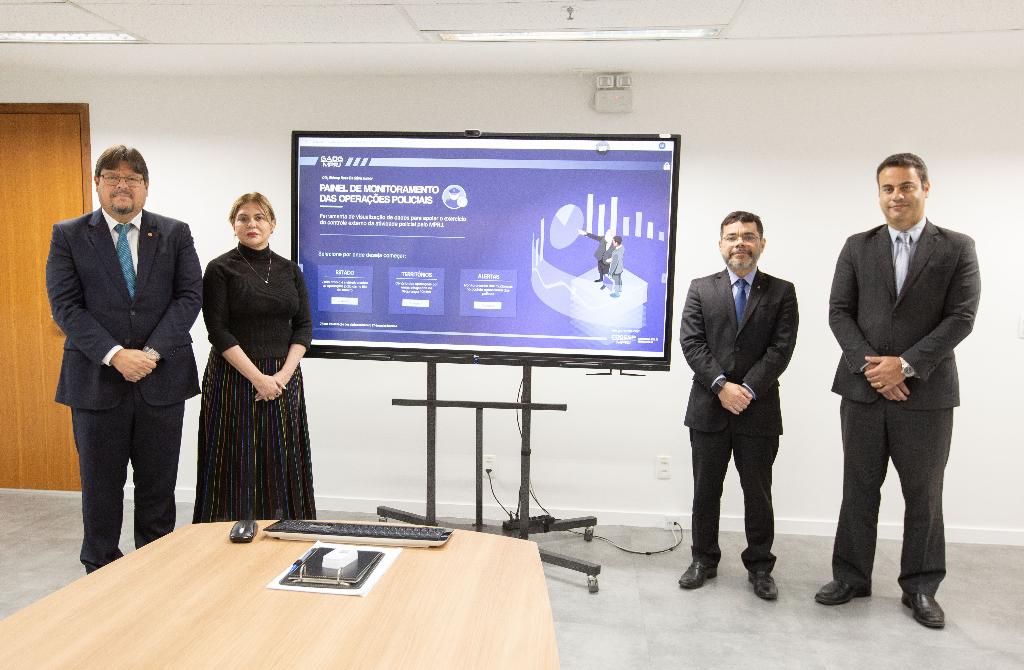O procurador-geral de Justiça Luciano Mattos recebeu, na tarde desta sexta-feira (17/05), a ouvidora nacional do Conselho Nacional do Ministério Público (CNMP), Ivana Cei e o membro auxiliar da Ouvidoria Nacional, Oswaldo D’Albuquerque Lima Neto, para apresentar o Painel de Monitoramento de Operações Policiais. A reunião contou com a participação e mediação do assessor da Secretaria-Geral de Planejamento Institucional, o promotor de Justiça Sidney Rosa, que explicou aos convidados como funciona a ferramenta desenvolvida pela equipe da Gerência de Análises, Diagnósticos e Geoprocessamento (GADG/MPRJ).