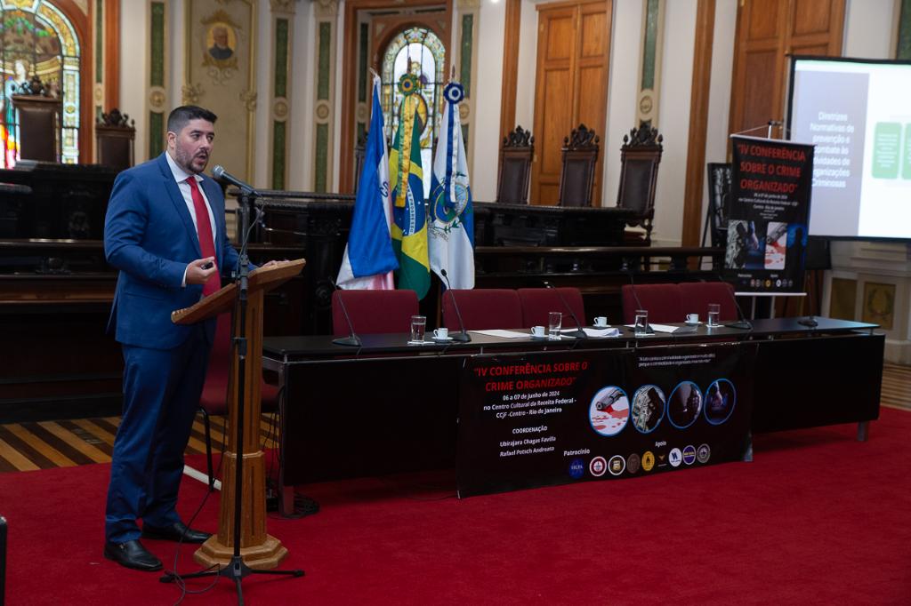 O promotor de Justiça e membro do Grupo de Atuação Especializada no Combate ao Crime Organizado (GAECO/MPRJ), Pedro Eularino Teixeira Simão, palestrou na manhã desta quinta-feira (06/06), na IV Conferência Internacional sobre o Crime Organizado. O evento teve como objetivo reunir juristas e representantes de instituições públicas para fomentar o debate jurídico de ideias e estratégias de enfrentamento ao crime organizado.