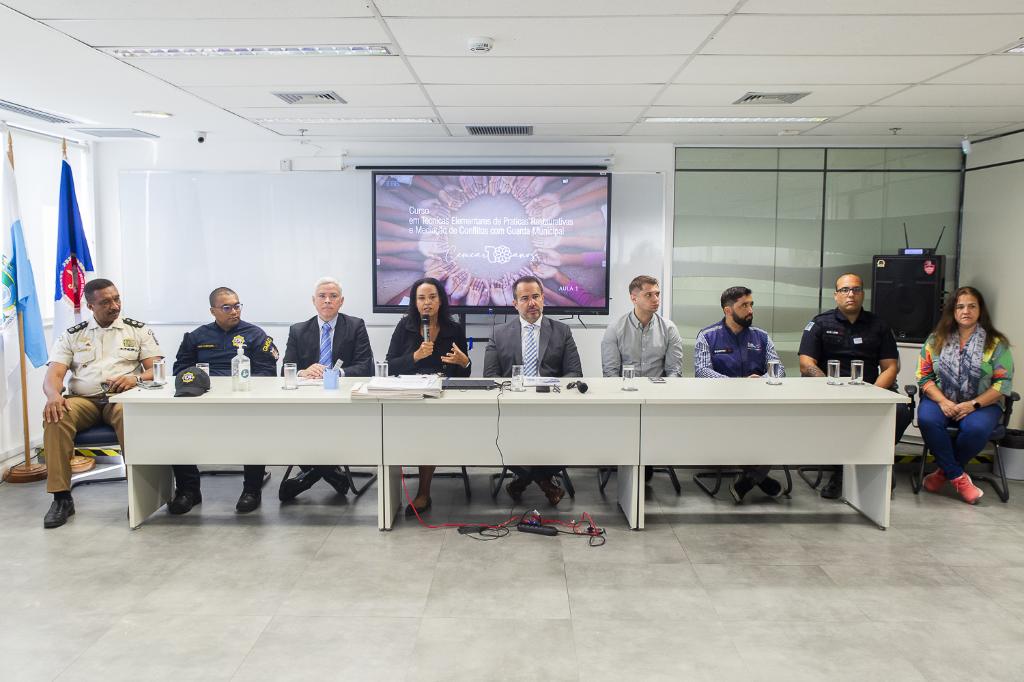 A mesa de encerramento foi composta pelos promotores de Justiça Atila Pereira de Souza, coordenador do CAO Criminal/MPRJ e representante oficial do procurador-geral de Justiça, Luciano Mattos; Roberta Rosa, coordenadora do curso; e Alexandre Couto Joppert, vice-diretor do IERBB/MPRJ. Também participaram os secretários de ordem pública do Rio de Janeiro e São Gonçalo, Brenno Carnevale e Anaelson Bonfim; os comandantes das Guardas Municipais de São Gonçalo e Itanguá, Wesley Lopes e Ewerton Mendes; o coordenador de Operações e Atividades Especiais da Guarda Municipal do Rio de Janeiro e representante da instituição, Ailton Ramos de Souza; e a professora Izabel Cristina de Oliveira, representando a Secretaria Municipal de Educação do Rio de Janeiro (SME-Rio).