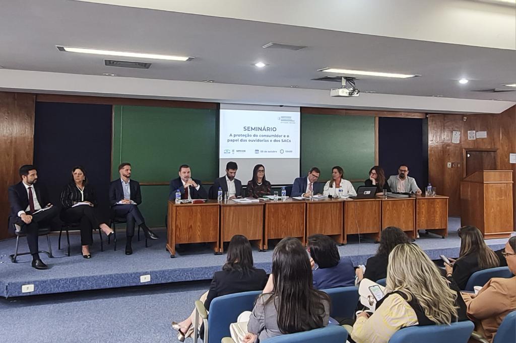 Augusto Vianna integrou a mesa ao lado de Paulo Roque Khouri, presidente do Instituto Educação para o Consumo; Vitor Hugo do Amaral Ferreira, diretor da Secretaria Nacional do Consumidor; Mariângela Sarrubbo, professora de Direito da PUC-SP; Lillian Jorge Salgado, representante do Instituto Defesa Coletiva; Marcia Moro, presidente da Associação Brasileira de Procons; Fábio Maranhão, representante da SAC Caixa Vida e Previdência; Danielle Silva de Andrade, da Ouvidoria Caixa Vida e Previdência; Felipe Takashi Yoshinaga, gerente da Ouvidoria Claro e Caio Cordeiro, da Ouvidoria Nubank.