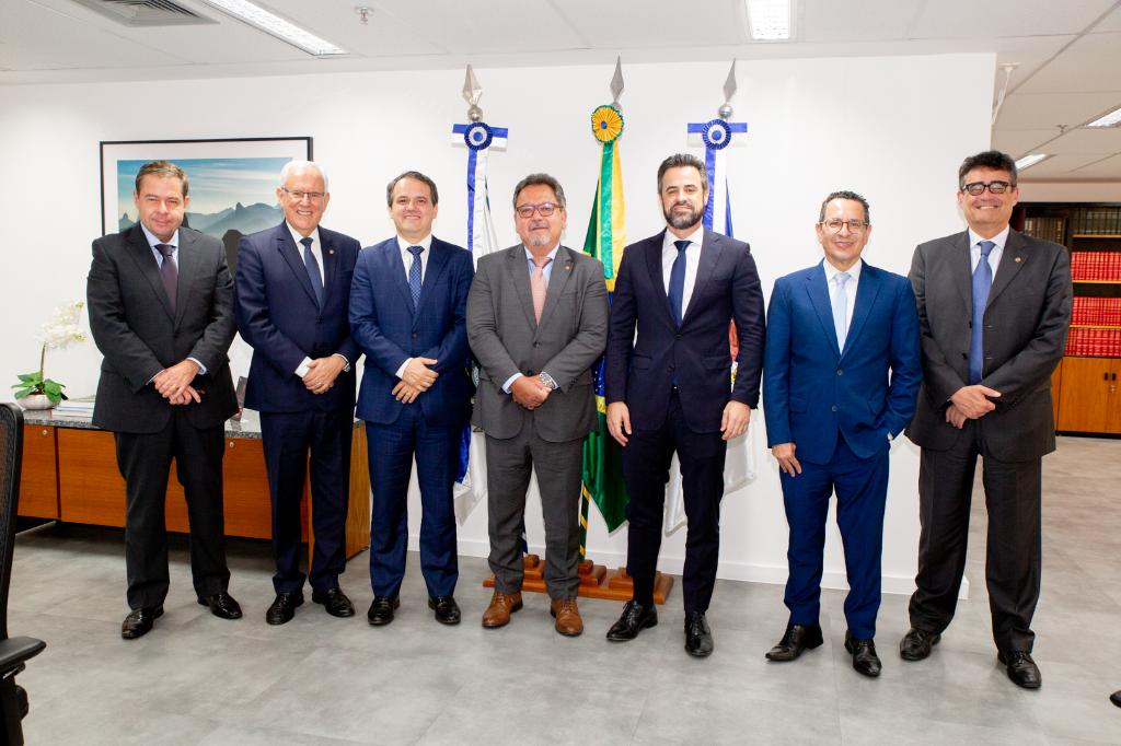 O procurador-geral de Justiça, Antonio José Campos Moreira, recebeu em seu gabinete, nesta segunda-feira (05/05), a visita institucional de membros do Ministério Público do Estado do Mato Grosso do Sul (MPMS). Estiveram presentes o ex-PGJ e atual conselheiro do Conselho Nacional do Ministério Público (CNMP) Paulo Cezar dos Passos; o PGJ do MPMS, Romão Ávila Milhan Junior; e o também ex-PGJ e atual procurador-geral Adjunto de Justiça Jurídico, Alexandre Magno Benites de Lacerda. Todos foram recebidos pelo chefe de Gabinete do MPRJ, Guilherme Schueler, o consultor especial, Carlos Roberto Jatahy, e o secretário-geral de Relações Institucionais e Defesa de Prerrogativas do MPRJ, Marfan Martins Vieira.