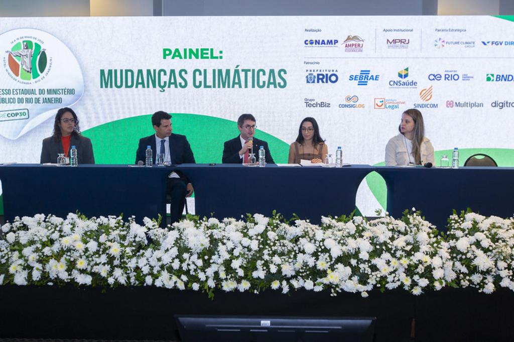O terceiro e último dia do Congresso Estadual do Ministério Público do Rio de Janeiro – Pré-COP 30, foi realizado na sexta-feira (16/05), no Hotel Windsor Flórida, no Flamengo, Zona Sul do Rio. O painel 1, com o tema "Mudanças climáticas", foi aberto pelo presidente da Amperj, Cláudio Henrique da Cruz Viana. Em seguida, o promotor de Justiça Vinícius Lameira, coordenador do Centro de Apoio Operacional das Promotorias de Justiça de Tutela Coletiva do Meio Ambiente e do Urbanismo (CAO Meio Ambiente e Ordem Urbanística/MPRJ), falou da atuação do MP na área ambiental. Ele apresentou um resumo da ADPF 708, que busca garantir o cumprimento à proteção do meio ambiente e ao combate às mudanças climáticas, com a mitigação de seus efeitos, e, em especial, destacou a operacionalização do Fundo Clima.