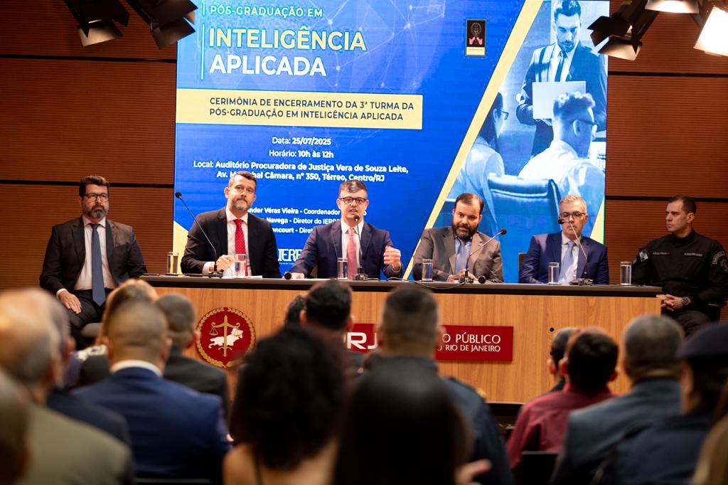 O Ministério Público do Estado do Rio de Janeiro, por meio do Instituto de Educação Roberto Bernardes Barroso (IERBB/MPRJ), realizou, nesta sexta-feira (25/07), a cerimônia de encerramento do curso de pós-graduação em Inteligência Aplicada, com a entrega de certificados e insígnias aos concluintes da terceira turma. A solenidade contou com a abertura do diretor do IERBB/MPRJ, promotor de Justiça Leandro Navega, que parabenizou os formandos pelo empenho e excelente trabalho no período.