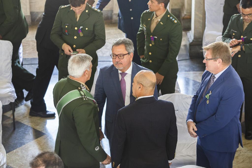 O procurador-geral de Justiça, Antonio José Campos Moreira, recebeu, nesta sexta-feira (22/08), a Medalha Exército Brasileiro, em solenidade realizada no Palácio Duque de Caxias, sede do Comando Militar do Leste, no Centro do Rio. O consultor especial do MPRJ, Carlos Roberto de Castro Jatahy, também esteve presente. A solenidade foi conduzida pelo comandante militar do Leste, general Kleber Nunes de Vasconcellos, que ressaltou a importância histórica da data e de Duque de Caxias, Patrono do Exército Brasileiro.