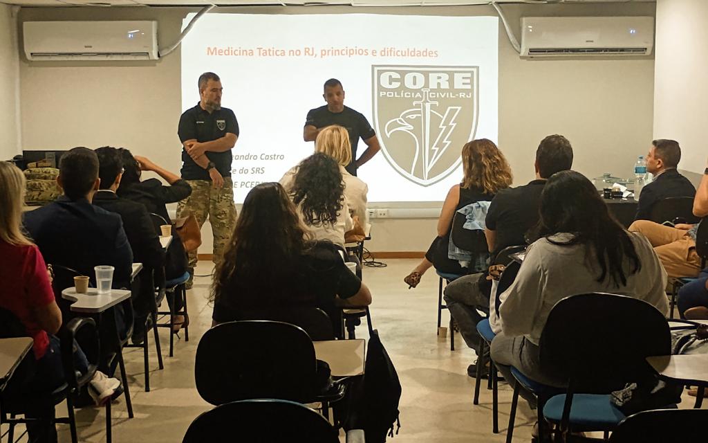 O primeiro módulo do dia foi conduzido pelo subchefe do Esquadrão Antibombas, George Rulff Bento, que apresentou um histórico da atuação da unidade especializada, com demonstrações de equipamentos utilizados, além de exemplos de materiais usados na fabricação de explosivos e na manipulação de granadas industriais e caseiras. O segundo módulo, ministrado pelo coordenador médico da CORE, Leandro Castro, abordou os conceitos de Medicina Tática, destacando diferentes formas de atendimento pré-hospitalar em áreas de combate.