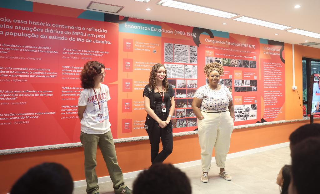 A recepção foi conduzida pelas estagiárias de História e Biblioteconomia, Samara Tarouquela e Evelyn Dayana, que apresentaram a equipe, as atividades do Centro de Memória e o papel do Ministério Público. Para tornar a experiência mais concreta, as estagiárias utilizaram exemplos do cotidiano, demonstrando como a instituição se faz presente na vida da população, por exemplo, com o esclarecimento de que o número 127 pode ser acionado gratuitamente para solicitar atendimento ou realizar denúncias à Ouvidoria do MPRJ.
