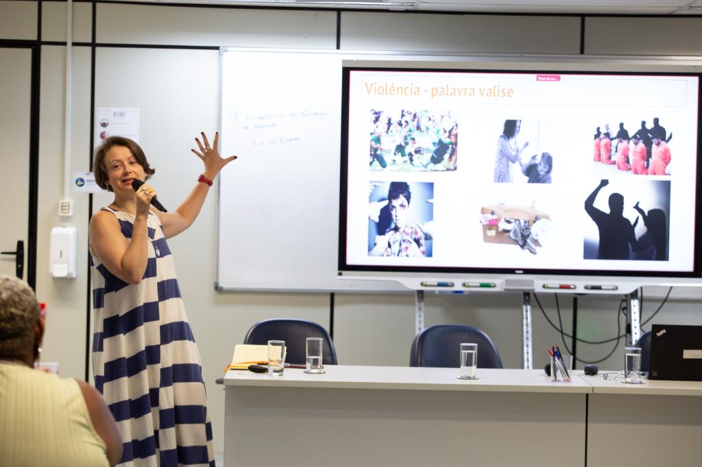 Em seguida, a psicóloga Brenda Pacheco discutiu os efeitos da violência, em especial a violência de gênero, no desenvolvimento infantil. Ela destacou que o enfrentamento só é eficaz quando há clareza conceitual: “Usamos a violência como se fosse uma coisa fixa, mas ela qualifica práticas e relações”. Brenda alertou ainda para a dupla responsabilização de mulheres quando não se considera a perspectiva de gênero: “O ideal da mãe perfeita é um estereótipo que produz injustiças e desigualdades no atendimento”.