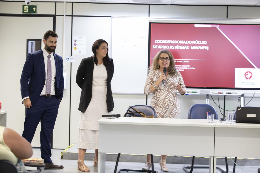 Em seguida, a procuradora de Justiça Patrícia Carvão, coordenadora do Núcleo de Apoio às Vítimas (NAV), apresentou o trabalho do núcleo ao lado do coordenador de Autocomposição, Victor Miceli, e da promotora de Justiça Fernanda Vieira de Moraes, assessora da Subprocuradoria-Geral dos Direitos Humanos. Foi explicado que, por muitos anos, o processo penal voltou-se apenas ao autor do crime, deixando vítimas desamparadas e, muitas vezes, sujeitas a violência institucional. O NAV foi criado para mudar esse cenário, oferecendo escuta acolhedora, avaliação de necessidades e orientação jurídica em linguagem acessível.