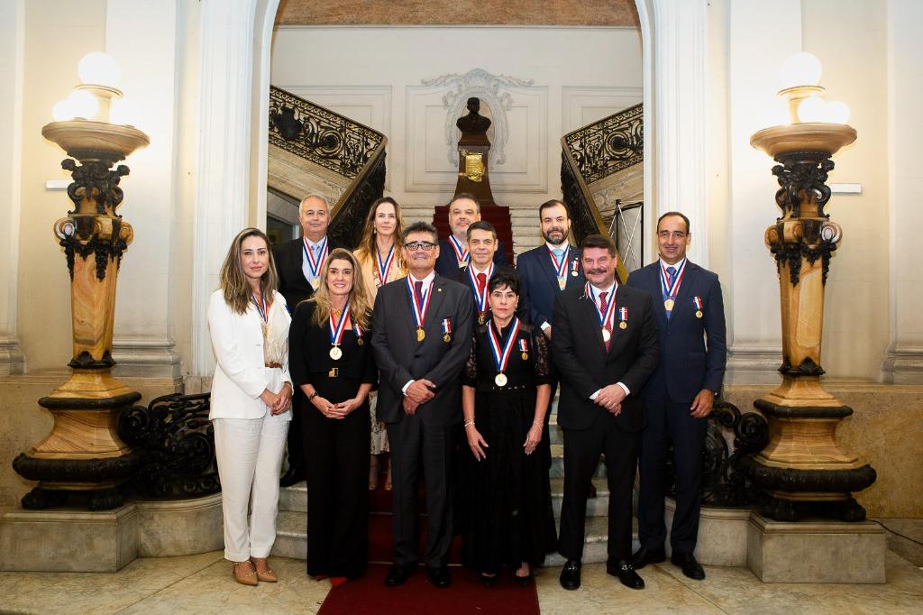 Onze membros do Ministério Público do Estado do Rio de Janeiro (MPRJ) foram agraciados, na noite desta terça-feira (02/12), com o Conjunto de Medalhas Pedro Ernesto, a mais alta honraria concedida pelo Legislativo carioca. A iniciativa é de autoria do presidente da Câmara Municipal, vereador Carlo Caiado. O procurador-geral de Justiça, Antonio José Campos Moreira; o consultor especial do MPRJ e procurador de Justiça Carlos Roberto de Castro Jatahy; e a corregedora-geral da Câmara, Bianca Lima, compuseram a mesa diretora da solenidade.
