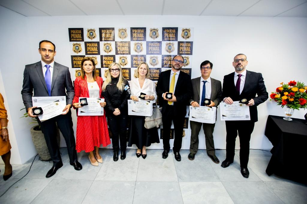 Membros do Ministério Público do Estado do Rio de Janeiro (MPRJ) foram agraciados, nesta sexta-feira (19/12), com a Medalha Amigo da Polícia Penal do Estado do Rio de Janeiro, concedida pela Secretaria de Estado de Administração Penitenciária (SEAP/RJ). Ao todo, onze integrantes da instituição receberam a honraria, destinada a pessoas que contribuem de forma contínua para o fortalecimento da Polícia Penal. O procurador-geral de Justiça, Antonio José Campos Moreira, também foi agraciado com a medalha.