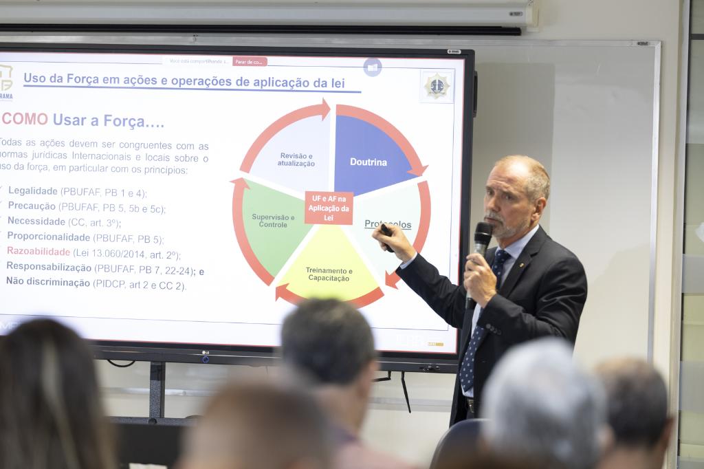 Ex-secretário de Segurança do Distrito Federal, o coronel da Polícia Militar Paulo Roberto Batista de Oliveira destacou, em sua apresentação, os procedimentos operacionais padrão que devem ser adotados pelas forças de segurança em situações de conflito. O palestrante ressaltou a necessidade de adoção de critérios bem definidos durante as ações policiais, notando a importância da adoção de protocolos institucionais como forma de minimizar possíveis erros individuais cometidos pelos agentes da lei.