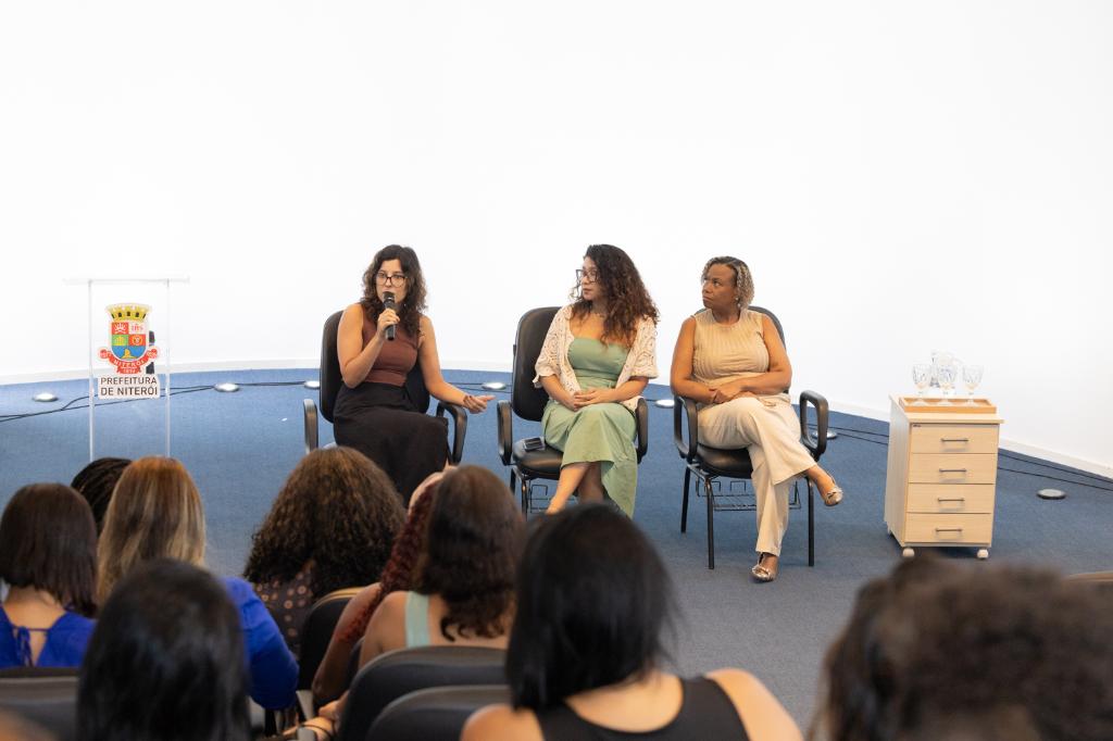 A promotora de Justiça Eyleen Marenco, subcoordenadora do CAOVD/MPRJ, abriu o evento ao lado da secretária da Mulher de Niterói, Thaiana Ivia.