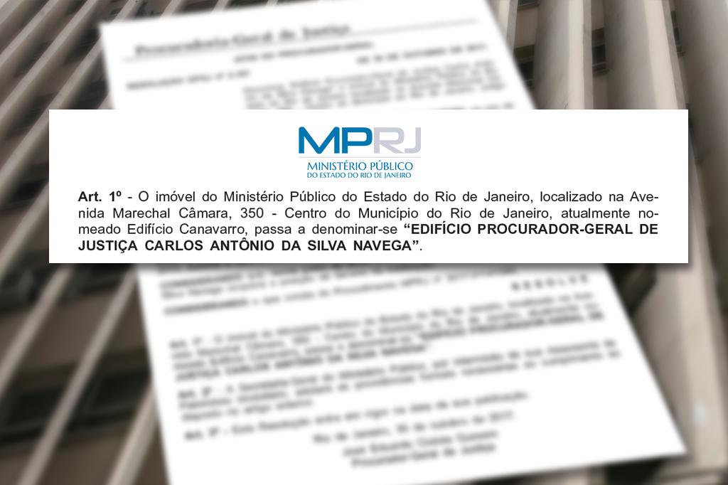 Em Resolução publicada no Diário Oficial desta terça-feira (31/10), o procurador-geral de Justiça, Eduardo Gussem, denomina “Edifício Procurador-Geral de Justiça Carlos Antônio da Silva Navega” o imóvel do Ministério Público do Estado do Rio de Janeiro localizado na Avenida Marechal Câmara, 350, atualmente nomeado Edifício Canavarro.