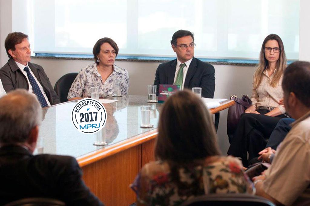 O procurador-geral de Justiça, Eduardo Gussem, e promotores de Justiça de Tutela Coletiva da Saúde da Capital e de Fundações reuniram-se, nesta quarta-feira (08/02), com o prefeito Marcelo Crivella e o secretário municipal de Saúde, Carlos Eduardo de Mattos. O encontro, que ocorreu na sede do Ministério Público do Estado do Rio de Janeiro (MPRJ), teve como objetivo buscar soluções para evitar a descontinuidade no atendimento em unidades de saúde após a suspensão de convênios da pasta com a Bio-Rio, Funrio e CEPSC (Centro de Estudos, Pesquisa e Desenvolvimento Tecnológico em Saúde Coletiva).