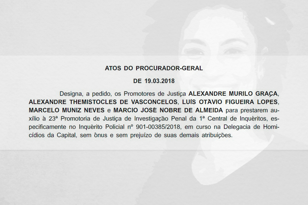 O procurador-geral de Justiça, Eduardo Gussem, designou um grupo de cinco promotores de Justiça do Ministério Público do Estado do Rio de Janeiro (MPRJ) para auxiliar a 23ª Promotoria de Justiça de Investigação Penal nas investigações dos assassinatos da vereadora Marielle Franco e do motorista Anderson Santos.