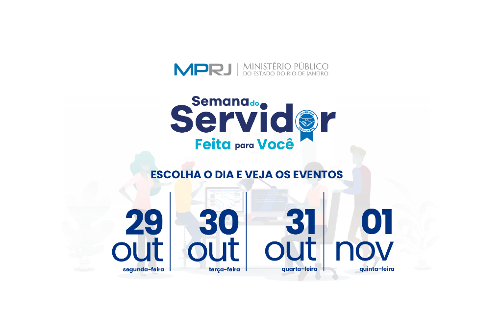 O Ministério Público do Estado do Rio de Janeiro (MPRJ) promoverá, entre 29 de outubro e 1º de novembro, diversos eventos relacionados à Semana do Servidor, instituída pela Resolução GPGJ nº 2.150/17, como desdobramento do Dia do Servidor, comemorado no domingo (28/10). Ao longo dos quatro dias, na cidade do Rio de Janeiro, acontecerão atividades nas áreas de saúde, beleza, cultura, bem-estar e confraternização. No interior, as ações foram realizadas na semana anterior, de 22 a 26 de outubro, nas cidades de Campos dos Goytacazes, Volta Redonda, Nova Friburgo, Macaé e Angra dos Reis, além de Nova Iguaçu, São Gonçalo e Duque de Caxias.
