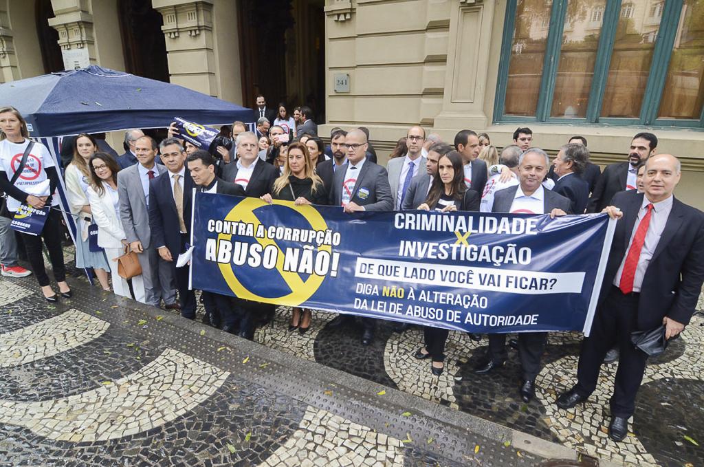 O Ministério Público do Estado do Rio de Janeiro (MPRJ), participou, com a presença de promotores e procuradores de Justiça, de manifestação pública contra o Projeto de Lei de Abuso de Autoridade, na manhã desta quinta-feira (22/08). O ato público, organizado pela Associação do Ministério Público do Estado do Rio de Janeiro (Amperj) e demais integrantes da Frentas-Rio, ocorreu em frente ao prédio da Justiça Federal, localizado na Avenida Rio Branco, nº 241, no Centro do Rio de Janeiro. O PL nº 7596/17 foi aprovado no último dia 14, em votação na Câmara dos Deputados, em Brasília. O objetivo dos manifestantes foi pedir ao presidente Jair Bolsonaro o veto integral do projeto.
