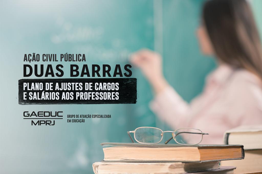 O Ministério Público do Estado do Rio de Janeiro (MPRJ), por meio do Grupo de Atuação Especializada em Educação (GAEDUC/MPRJ), ajuizou Ação Civil Pública (ACP) com pedido de urgência para que o Município de Duas Barras cumpra adequadamente a Meta 18 do Plano Nacional de Educação (PNE), que prevê a necessidade de existência de planos de carreira para os professores. De acordo com a ACP, o município não vem cumprindo o previsto na Lei nº 13.005/2014, que determina que os planos de carreira prevejam a bipartição da jornada dos docentes, com a reserva de 1/3 da carga horária para atividades extraclasse, nem tampouco aprovou alterações necessárias no PCR dos profissionais da educação para a adequação ao PNE.