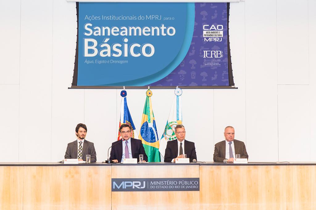 O Ministério Público do Estado do Rio de Janeiro (MPRJ), por meio do Centro de Apoio Operacional do Meio Ambiente (CAO Meio Ambiente/MPRJ), promoveu, nesta sexta-feira (31/01), evento para apresentar ações institucionais do MPRJ relacionadas ao saneamento básico (no caso, água, esgoto e drenagem). Durante o evento, foi assinado um convênio para intercâmbio de dados entre o MPRJ e a Agência Reguladora de Energia e Saneamento Básico do Estado do Rio de Janeiro (Agenersa). A mesa de abertura foi formada pelo procurador-geral de Justiça, Eduardo Gussem, o coordenador do CAO Meio Ambiente, promotor de Justiça André Dickstein, o presidente da Agenersa, Luigi Troisi, e o presidente da Companhia Estadual de Águas e Esgotos do Rio de Janeiro (Cedae), Hélio Cabral.