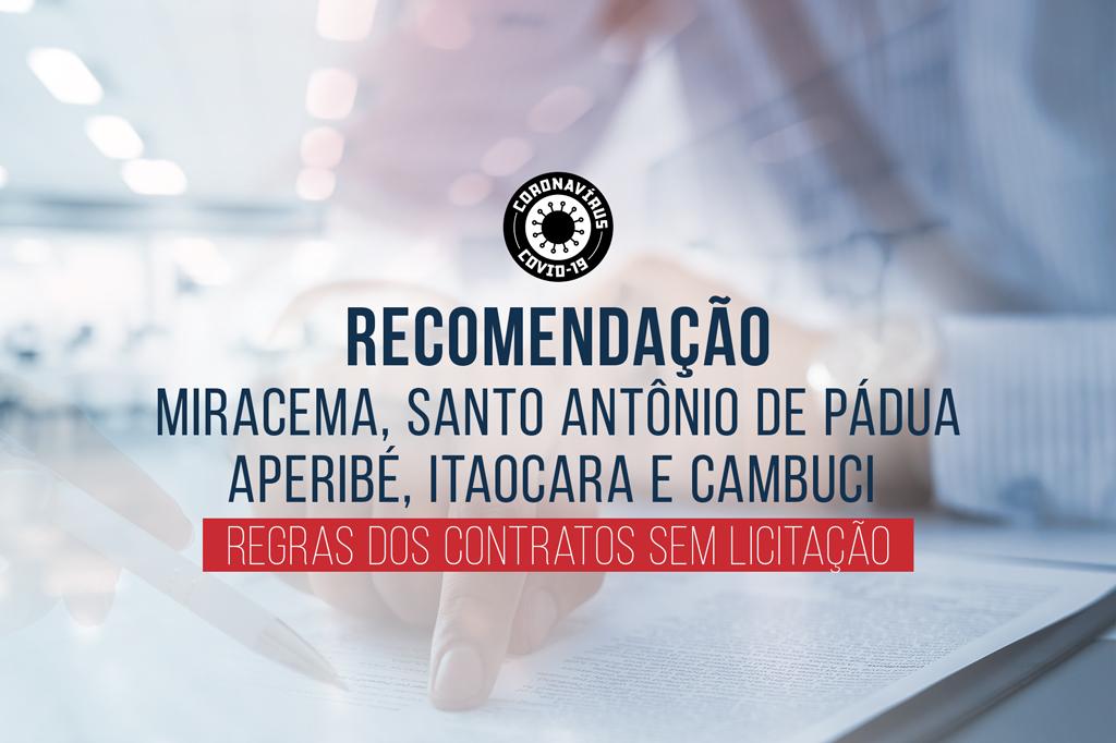 O Ministério Público do Estado do Rio de Janeiro (MPRJ), por meio da 1ª Promotoria de Justiça de Tutela Coletiva do Núcleo Santo Antônio de Pádua, expediu, nesta segunda-feira (30/03), Recomendação aos municípios de Miracema, Santo Antônio de Pádua, Aperibé, Itaocara e Cambuci, mediante as suas Secretarias Municipais de Saúde e demais órgãos correlatos. O objetivo é dar continuidade ao acompanhamento das políticas públicas e ações realizadas na contenção e no combate eficiente ao novo coronavírus (Covid-19), sem, contudo, perder de vista a necessidade de fiscalização de questões relacionadas à cidadania, sobretudo quanto à prevenção de eventuais danos ao erário.