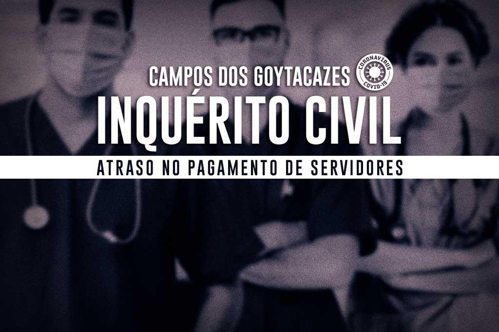 A portaria de instauração do inquérito solicita à Prefeitura de Campos que em um prazo de 15 dias, contados do recebimento da notificação, informe, entre outros dados: a quantidade total de servidores contratados durante a pandemia e de contratados exclusivamente para a área de saúde; a quantidade de servidores da área de saúde contratados para atender pacientes com Covid-19; se houve ou há atraso no pagamento dos servidores contratados e, em caso positivo, quando foi o último pagamento efetuado e quais parcelas estão atrasadas.