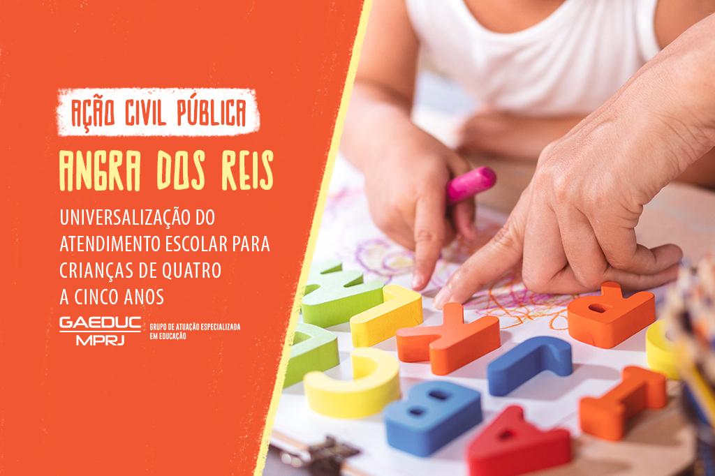 O Ministério Público do Estado do Rio de Janeiro (MPRJ), por meio do Grupo de Atuação Especializada em Educação (GAEDUC/MPRJ), em auxílio à 2ª Promotoria de Justiça de Tutela Coletiva do Núcleo Angra dos Reis, ajuizou ação civil pública, em face do município de Angra dos Reis, para que a gestão municipal cumpra a primeira meta do Plano Nacional de Educação (PNE). A meta número 1 determina que os municípios universalizem, até 2016, a educação infantil na pré-escola para crianças de quatro a cinco anos de idade, além de ampliar a oferta de educação infantil em creches para atender, no mínimo, 50% das crianças de até três anos até o final da vigência do Plano, em 2024.