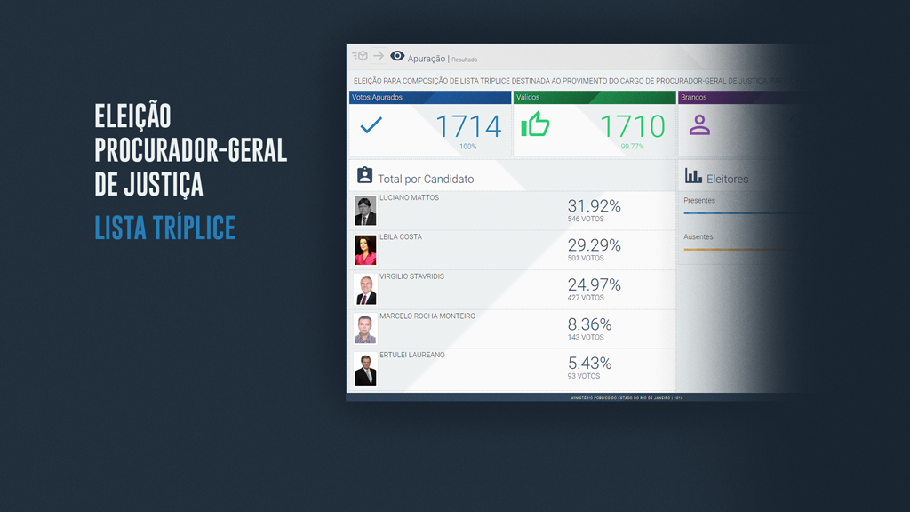 No total, exerceram seu direito ao voto 904 promotores e procuradores de Justiça, entre os 907 membros ativos habilitados a participar da eleição, que puderam escolher até três concorrentes ao cargo. Foram computados 1.714 votos apurados, sendo 1.710 válidos, com 2 nulos e 2 votos em branco registrados. Os eleitores exerceram seu voto de forma presencial, por meio de computadores instalados na Sala de Sessões dos Órgãos Colegiados, ou através de computadores interligados à rede de dados do Ministério Público do Estado do Rio de Janeiro (MPRJ), sendo todos os votos computados através do Sistema Eletrônico de Votação (SEV). A idoneidade do sistema é garantida pela auditagem externa realizada pela Pontifícia Universidade Católica do Rio de Janeiro (PUC-Rio).